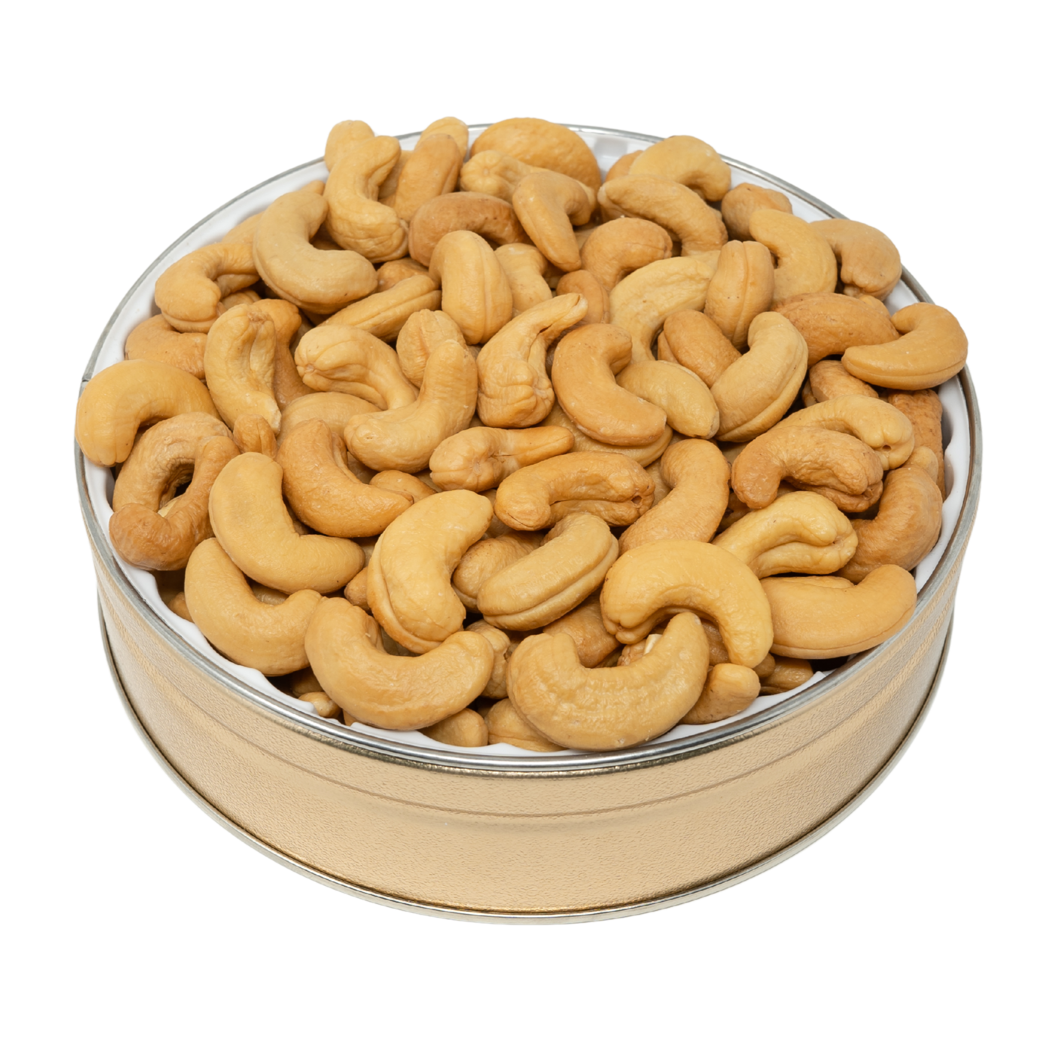 Giant Cashews Tin 16 oz. SALTED. Our holiday 16 oz. tin is filled with our famous Giant Cashews, freshly roasted and salted to perfection!