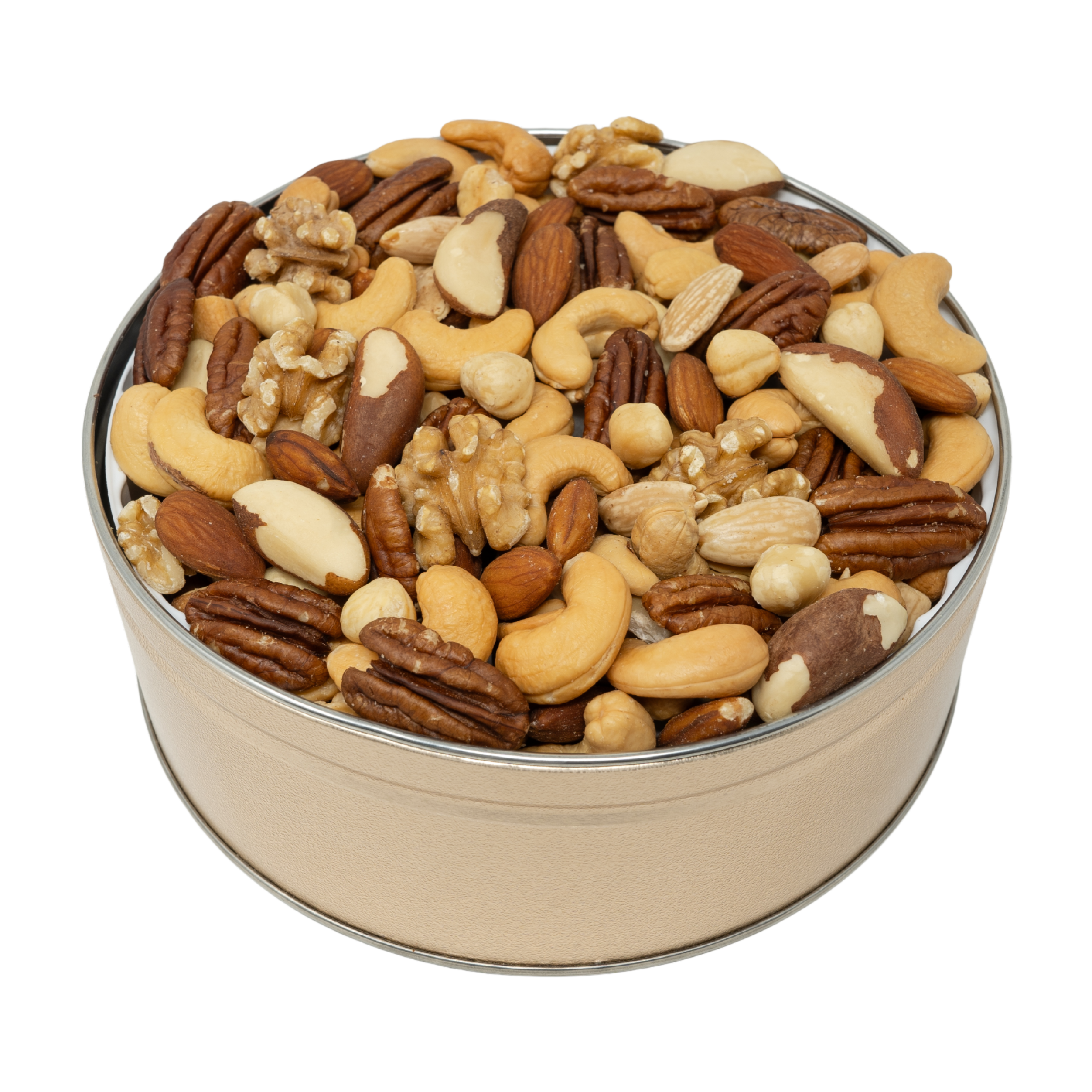 Gourmet Mixed Nuts Tin 24 oz. NO SALT Sale! from 2699 /per Qty. Add to Cart This item is currently on backorder but you can still purchase it now and we'll ship as soon as more become available. Description Ingredients Description Gourmet Mixed Nuts Tin 24 oz. NO SALT. Our holiday 24 oz. tin is filled with delicious Gourmet Mixed Nuts (40% cashews, almonds, blanched almonds, hazel nuts, pecans, walnuts & brazil nuts). Ingredients Gourmet Mixed Nuts: Almonds, Brazil nuts, pecans, walnuts, filberts, blanched almonds & peanut oil. Made in a facility that processes peanuts, tree nuts, wheat, dairy, sesame, soy & egg. SKU: 24TM-NS